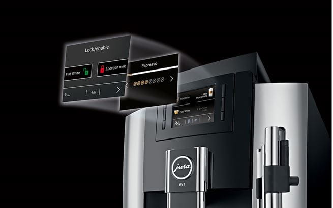 The WE8 offers 12 different specialities. JURA has perfected the complete brewing process for short speciality coffees, allowing the WE line to make them to professional barista standard every time. The six-level Aroma G3 grinder ensures that the coffee is optimally ground. It always grinds the beans fresh, quickly yet gently to preserve the aroma. The Pulse Extraction Process (P.E.P.®) developed by JURA optimises the extraction time. To make a ristretto or espresso, it forces the hot water through the ground coffee at short intervals. The One-Touch function on the WE8 allows you to make trend specialities finished with milk and milk foam at the touch of a button, without having to move the cup.